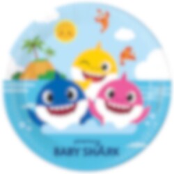 8 st. papptallrikar i en blå färg och med motiv av den glada och roliga hajfamiljen från Pingfongs populära barnlåt Baby Shark. Perfekta att duka fram på bordet när det vankas kalas med Baby Shark tema. Tallrikarna är ca 23 cm i diameter.