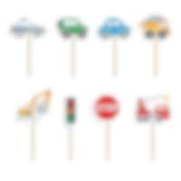 8 st. cake toppers med olika färgglada fordon, trafikljus och vägskyltar. Perfekta att dekorera tårtor och bakverk med till barnkalas med fordonstema! De är ca 9 cm höga och är tillverkade av papper och trä.