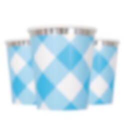 8 st. pappmuggar i ett blå- och vitrutigt mönster samt med silverfolierade kanter. Ett fint dukningstillbehör till kalaset. Muggarna är ca 10 cm höga och rymmer ca 270 ml.