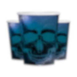 8 st. pappmuggar från temat Boneshine Fever som skimrar i färgerna blått och svart samt har motiv av läskiga dödskallar. Muggarna är 10 cm höga och rymmer 250 ml.