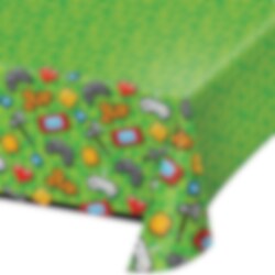 Fin grön bordsduk av plast med häftigt motiv av flera olika spelikoner. Duken är ca 137 x 259 cm stor.