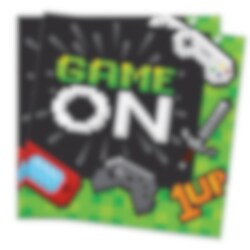 16 st. gröna och svarta servetter med snygga spelmotiv, bland annat texten "Game on" i mitten. Servetterna är i 2-lager och är ca 33 x 33 cm stora utvikta.