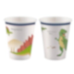 8 st. fina pappersmuggar med vit bakgrund och blå kanter. Muggarna har även fräcka motiv av en Stegosaurus och en Tyrannosaurus Rex. Muggarna är ca 10 cm höga och rymmer ca 270 ml.