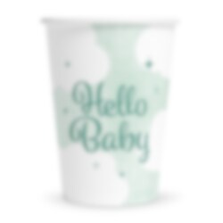 Duka upp till en fin babyfest med dessa dekorativa pappmuggar med texten Hello Baby. Den mjuka designen i ljusa toner gör dem till ett fint inslag på festbordet och de passar perfekt till baby shower, dop och välkomstfirande.