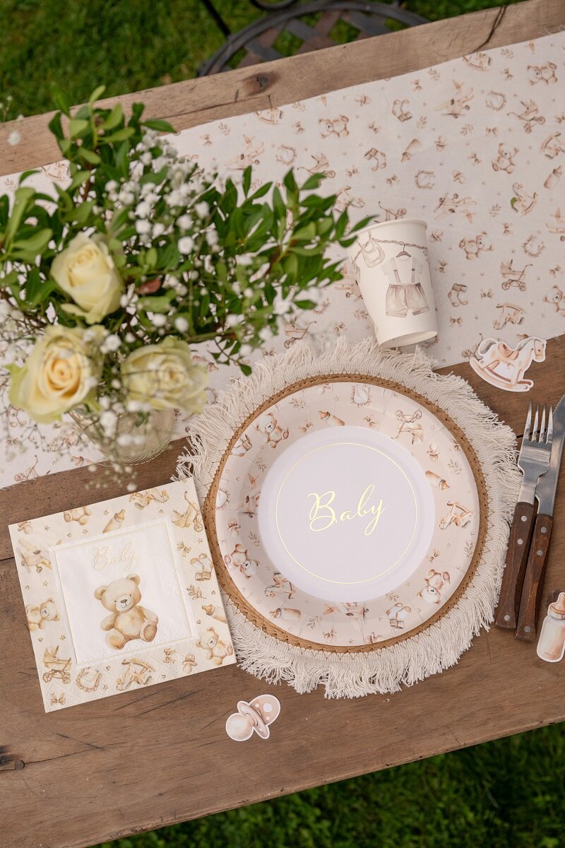 Fina papptallrikar ur Little Teddy-serien som passar lika bra till babyshower som till dop och andra firanden för den lilla. Den dekorativa kanten med nallar och små detaljer från barnets första tid ramas in av glänsande guldfolie som ger dukningen en elegant känsla.