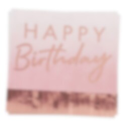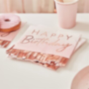 16 st. servetter i rosa ombre och med roséguldfolierade fransar samt texten "Happy Birthday" från kollektionen Mix it Up. Ett passande tillbehör att ha med till kalasdukningen. Servetterna är 2-lagers och är ca 33 x 33 cm stora utvikta.