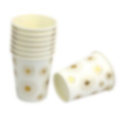 10 st. eleganta vita pappmuggar med mönster av tusenskönor i guld. Muggarna är 10 cm höga och rymmer 250 ml .