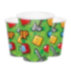 8 st. gröna pappersmuggar med motiv av olika spelikoner. Muggarna är ca 10 cm höga och rymmer ca 266 ml.