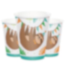 8 st. pappmuggar med gulligt motiv av sengångare på kalas. Muggarna är ca 10 cm höga och rymmer ca 266 ml.