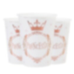 10 st. pappmuggar i en fin vit färg och med roligt prinsessmotiv i roséguldfolie. Superfina att ha med till dukningen till ditt prinseskalas. Matcha muggarna med tallrikar, servetter och andra tillbehör i samma tema för den perfekta dukningen.