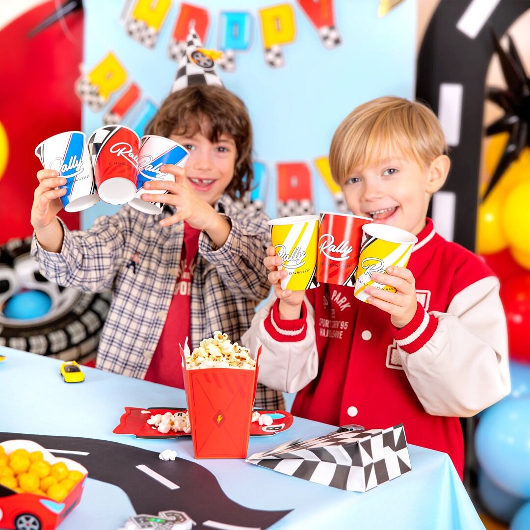6 st. pappmuggar med fartfyllt Rally Championship-motiv i gult, vitt och rött. Perfekta när du vill få till en enhetlig och rolig dukning på kalaset med Racing Car-tema.