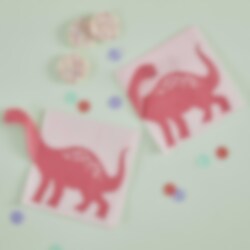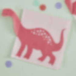 16 st. små servetter i en ljusrosa färg med motiv av en mörkrosa dinosaurie som du kan vika ut huvudet på för en kul effekt. Ett fint komplement till dukningen på kalaset med rosa dinosauretema.