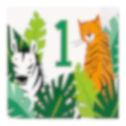 16 st. 1-års servetter i vit färg med motiv av söta små safaridjur i djungeln. Snygga att duka fram på bordet när det är dags för kalas. Passar perfekt med våra andra tillbehör från safaritemat.