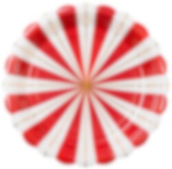 8 st. röd- och vit randiga lyxiga tallrikar med guldfolierade sträck. Tallrikarna är 19,5 cm i diameter och är tillverkade av papp.
