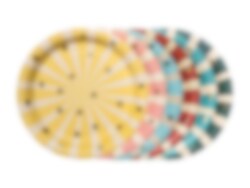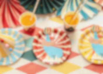 Duka upp en färgsprakande fest med dessa cirkusinspirerade assietter! Med sina klassiska ränder i rött, gult, blått och vitt, samt gnistrande guldfärgade stjärndetaljer, ger de dukningen en lekfull och festlig känsla. Assietterna är 18 x 18 cm stora och perfekta för förrätter, kakor eller andra godsaker.