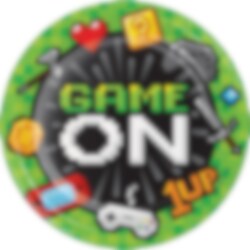 8 st. fina papperstallrikar. Tallrikarna är svarta med gröna kanter och har flera små TV-spels relaterade motiv, bland annat texten "Game on" i mitten. Tallrikarna är ca 23 cm i diameter.