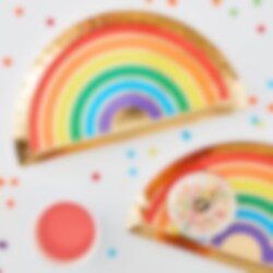 8 st. vackra regnbågsformade tallrikar med guldfolierade kanter och med motiv av en regnbåge. Tallrikarna är tillverkade av papper och är ca 27 x 16 cm stora.