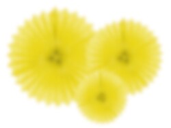 3 st. dekorationsrosetter i härlig gul färg. Rosetterna är enkla att veckla ut och hänga upp på väggen eller över bordet för att skapa en festlig stämning. Passar perfekt till kalas, dop, babyshower och andra firanden.
