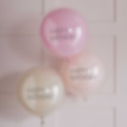 3 st. snygga ballonger med dubbla lager i nyanserna rosa, ivory och peach och med texten Happy Birthday. Fina att ha när det är dags att pynta till din födelsedag! Ballongerna kan blåsas upp med luft eller med helium och blir ca 45 cm i diameter som max uppblåsta.