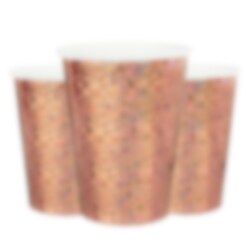 10 st. snygga holografiska pappmuggar som glittrar i roséguld. Superfina att ha när det är dags att duka fram till ditt kalas. Muggarna är ca 9,7 cm höga och rymmer 270 ml.