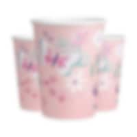 8 st. pappersmuggar i en ljusrosa färg med vita kanter och med motiv av vackra fjärilar bland blommor. Duka fram dessa för att göra dukningen extra fin när det vankas kalas. Muggarna är ca 10 cm höga och rymmer ca 250 ml.