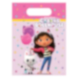 6 st. kalaspåsar av plast med gulliga motiv från Gabby's Dollhouse, som Gabby, Kitty Fairy och färgglada ballonger. Perfekta att fylla med godis, små leksaker eller roliga överraskningar som barnen får ta med sig hem från kalaset.