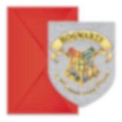 6 st. formskurna inbjudningskort med motiv av Hogwarts emblemet från Harry Potter. Använd dessa till att bjuda in dina kompisar till ett magiskt roligt Harry Potter kalas.