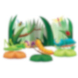 Dessa färgglada 3D-bordsdekorationer i papp med honeycomb-baser skapar en lekfull och naturinspirerad kalasdukning. Setet innehåller 4 delar: en bakgrund (30 x 69 cm), en skalbagge (17,6 x 23 cm), en gräshoppa (18,7 x 24,3 cm) och en larv (22,6 x 25 cm). Perfekta för att lyfta in naturens små kryp på festen!