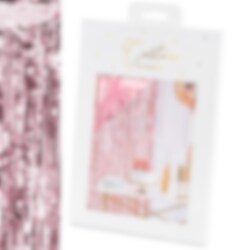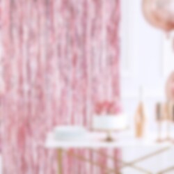 Folierat draperi i en underbart skimrande roséguld färg. En tjusig dekoration att hänga i en dörröppning eller på väggen inför kalaset, festen eller babyshowern. Draperiet är ca 90 x 250 cm stort. Observera att tejp eller liknande för att fästa dekorationen ej följer med.