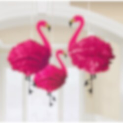 3 st. hängande dekorationer i honeycomb föreställande majestätiska flamingos. En imponerande dekoration till kalaset eller festen. Dekorationerna är ca 49,5 cm stora när dem är hopsatta.