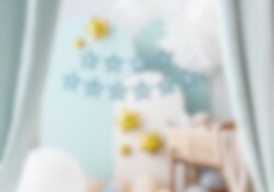 Fin girlang med motiv av blå stjärnor med texten "Baby shower" i vit färg. Dekorera rummet med denna girlang inför Babyshower festen för en kul effekt. Girlangen är 290 cm lång och motiven är 16,5 x 17,5 cm stora.