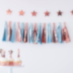 Elegant girlang med många tofsar i ljusblått och roséguld. En vacker dekoration att ha till Babyshowern. Girlangen har totalt 16 st. tofsar och är ca 1,5 meter lång.