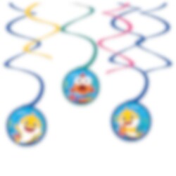 Hängande dekorationer i färgglada färger och med motiv från temat Baby Shark på båda sidor av dekorationen. Häng upp dessa i kalasrummet för en rolig effekt. Förpackningen inkluderar 3 st. snören med motiv som är ca 60 cm långa och 3 st. snören som är ca 30 cm långa.