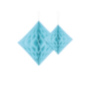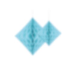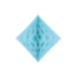 Stilig diamantformad dekoration i ljusblått honeycomb mönstrat papper som enkelt viks och hålls ihop med dubbelhäftande tejp. Sedan kan den hängas upp i det medföljande snöret. Dekorationen finns tillgänglig i två storlekar, 20 eller 30 cm hög. Priset avser en styck.