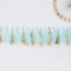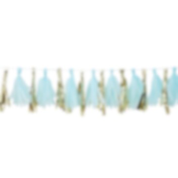Vacker girlang med många tofsar i ljusblått och guld. En superfin dekoration till Babyshowerfesten. Girlangen har totalt 16 st. tofsar och är ca 2 meter lång.