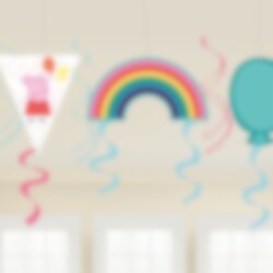 3 st. vackra hängande dekorationer med 3 st. tillhörande swirls med kul Peppa Pig motiv. En häftig dekoration att ha i kalasrummet när du ska ha kalas med Peppa Pig som tema. Ca 45 cm långa.
