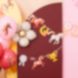 En underbar girlang med hästar, hästskor, rosetter och pokaler i glada färger – perfekt till ett hästkalas eller för alla som älskar ridning! Girlangen är 270 cm lång och hästarna är ca 18,5 x 22 cm. Förpackningen inkluderar ett 5 meter långt snöre för enkel upphängning.