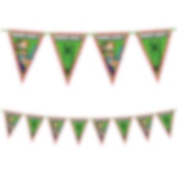 Flaggirlang av papper med motiv från Minecraft. En snygg dekoration att hänga upp i kalasrummet när det är dags för festligheter.