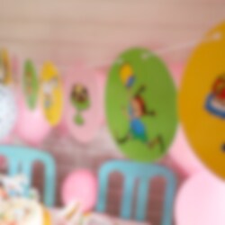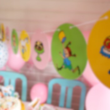 Färgglad girlang med motiv av Pippi och hennes kära vänner från Pippi Långstrump. En imponerande dekoration att hänga upp på ditt Pippi-kalas. Girlangen är tillverkad av papp och är 300 cm lång och motiven är ca 16 cm stora.