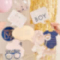 10 st. photoprops i fina färger med olika babyrelaterade motiv. Du och dina gäster kan använda dessa för att ta roliga kort under Gender Reveal partyt.