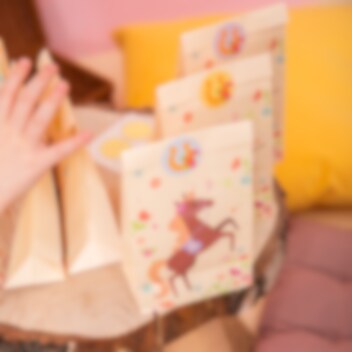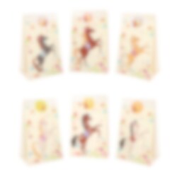 Dessa fina kalaspåsar med hästmotiv är perfekta att fylla med godis eller små presenter till gästerna. Påsarna är 18 x 11 cm stora och försluts med medföljande klistermärken.