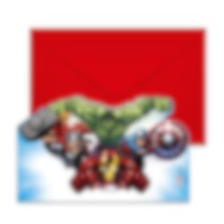 6 st. formskurna inbjudningskort med motiv av de ikoniska superhjältarna Iron Man, Captain America, Hulken och Thor från Avengers. Perfekta att skicka ut till dina vänner för att bjuda in dem till ett roligt superhjältekalas.