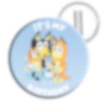 En badge med motiv av Bluey och texten 'It's My Birthday'. Perfekt för födelsedagsbarnet att bära och fira sin speciella dag. Badgen har en diameter på 6 cm.