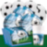 Detta färdiga kalaspaket i fotbollstema med originaltillbehör inkluderar tallrikar (23 cm), pappmuggar (200 ml) och servetter (33 x 33 cm) för 8 eller 16 eller personer, utöver det så ingår 10 st. ballonger med fotbollsmotiv och en grön bordsduk av plast (137 x 274 cm). Komplettera gärna med kalaspåsar eller partyboxar, godis, leksaker, dekorationer och spännande baktillbehör.