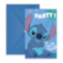 6 st. blå inbjudningskort med ett gulligt motiv av Stitch från Disney's populära film Lilo & Stitch. Inbjudningskorten är 14 x 8 cm stora och förpackningen inkluderar även 6 st. blå kuvert.