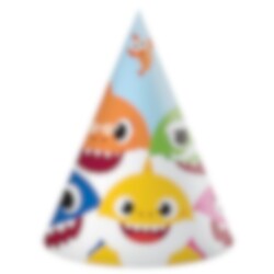6 st. kalashattar i en matt ljusblå färg och med motiv av hela hajfamiljen från låten Baby Shark. Dela ut dessa till gästerna under kalaset med Baby Shark som tema. Hattarna är ca 19 cm höga och sätts på plats med hjälp av ett resårband.