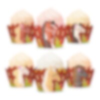 Förvandla vanliga muffins till något alldeles extra med dessa gulliga muffinsöverdrag med hästmotiv. Designade som små trästaket med färgglada hästar ger de direkt ett lekfullt och lantligt intryck, perfekt för hästkalas. Överdragen är 7,5 cm breda och cirka 5 cm höga, lätta att sätta runt färdiggräddade muffins.