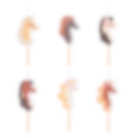 Toppa muffins, tårta eller snittar med dessa charmiga cake toppers i hästtema. Setet innehåller allt från galopperande hästar till hästskor, rosetter och prispokaler, perfekt för att skapa ett riktigt hästfestligt dessertbord. Dekorationerna är cirka 11 cm höga och tillverkade av trä och papper.