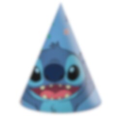 6 st. blå kalashattar av papp med roliga motiv från Disney's Lilo & Stitch. Hattarna är ca 19 cm höga och hålls plats med ett resårband.