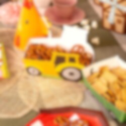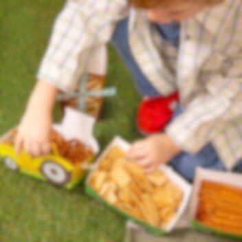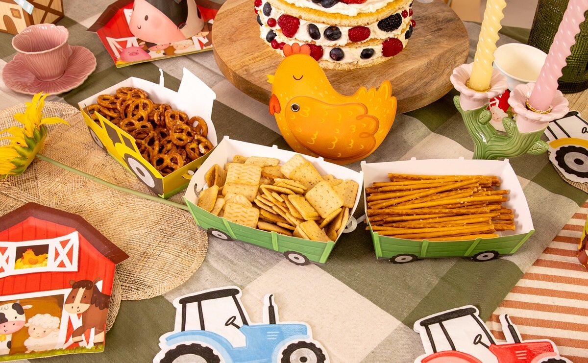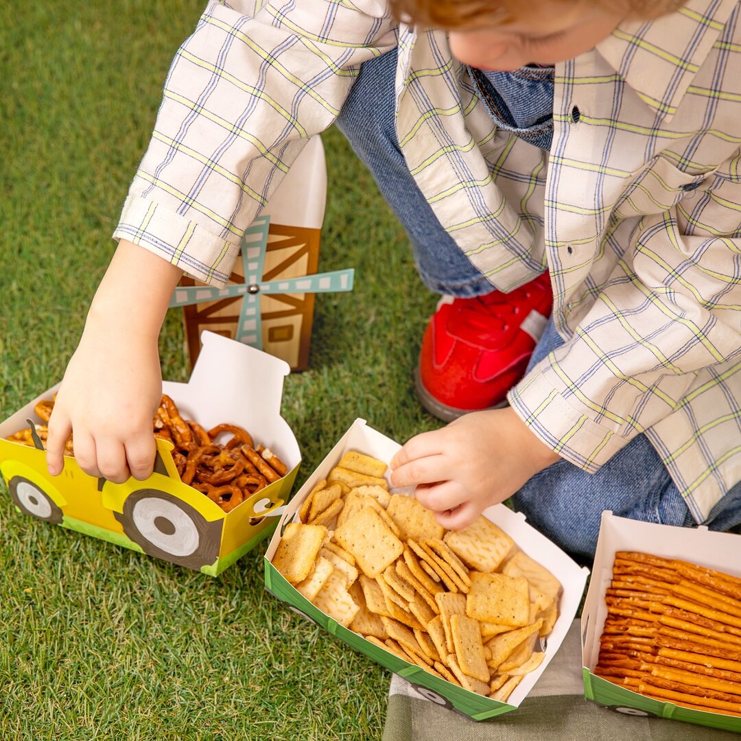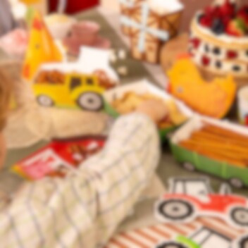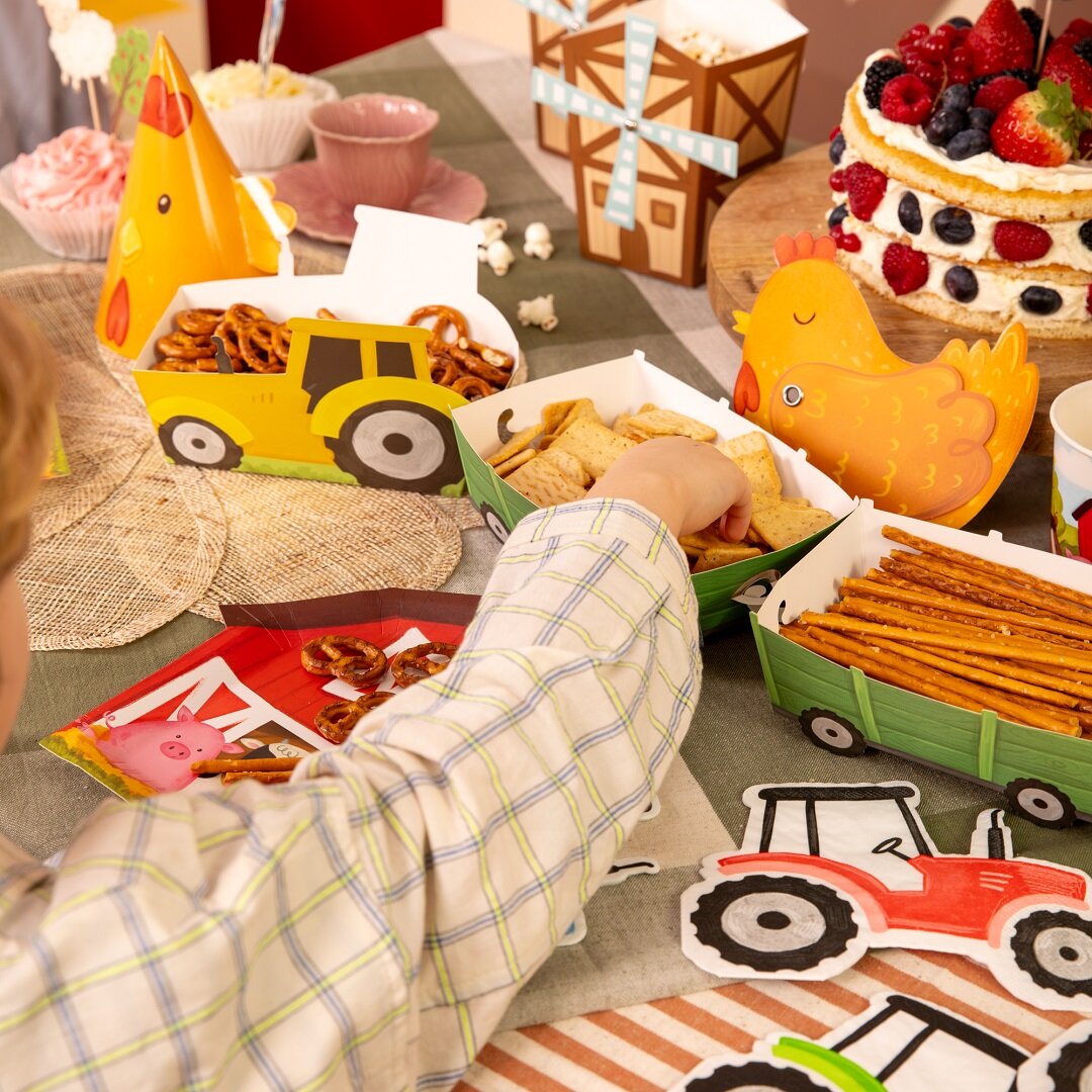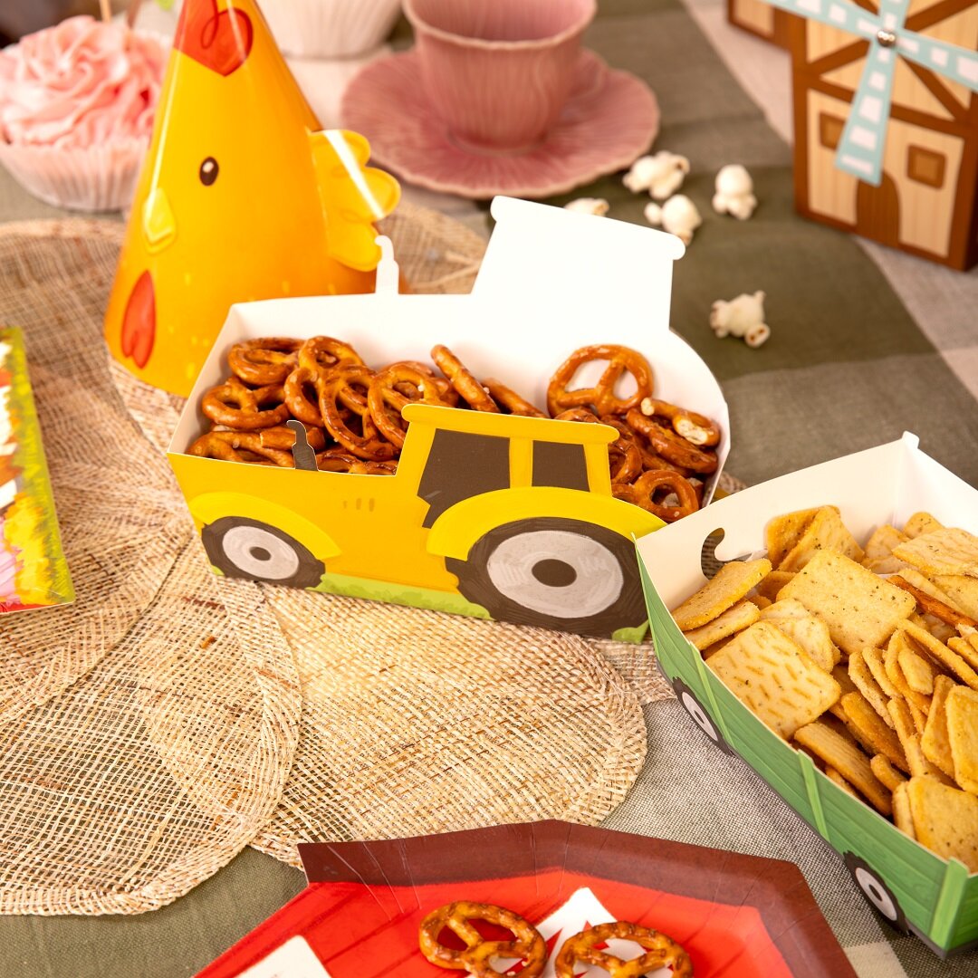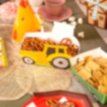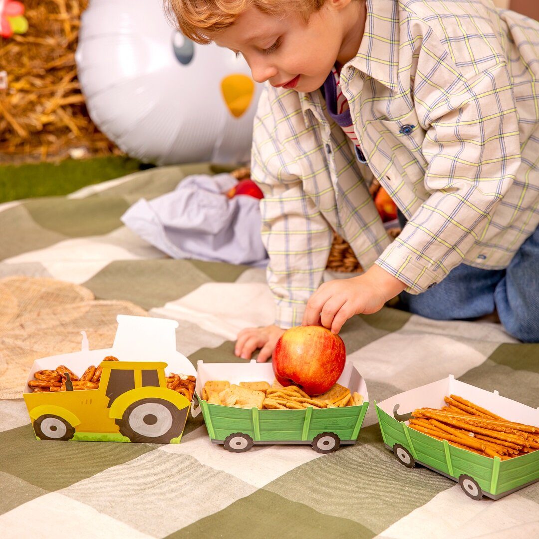 3 st. snacksboxar formade som traktorer med tillhörande vagnar som blir en lekfull och iögonfallande detalj på kalasbordet. De passar perfekt till ett barnkalas med bondgårdstema och gör serveringen extra rolig för små gäster.